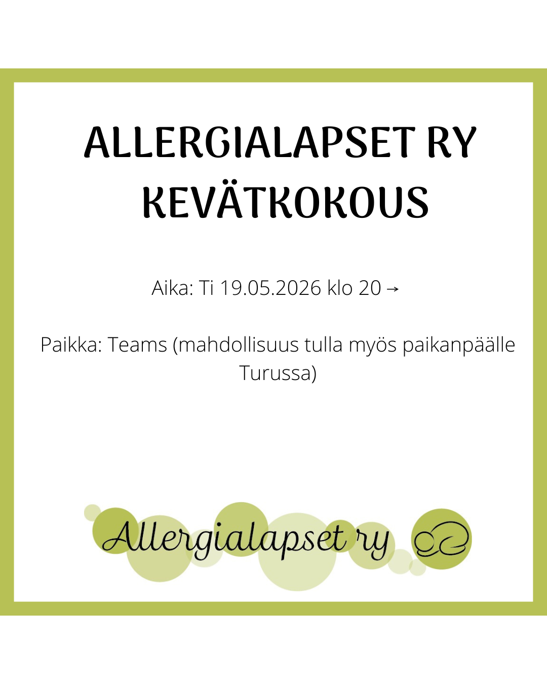 Allergialapset ry:n sääntömääräinen syyskokous järjestetään Ti 19.05.2026 klo 20 --> Kokous järjestetään Teamsin välityksellä, jonka lisäksi mahdollisuus osallistua kokoukseen myös Turussa paikan…